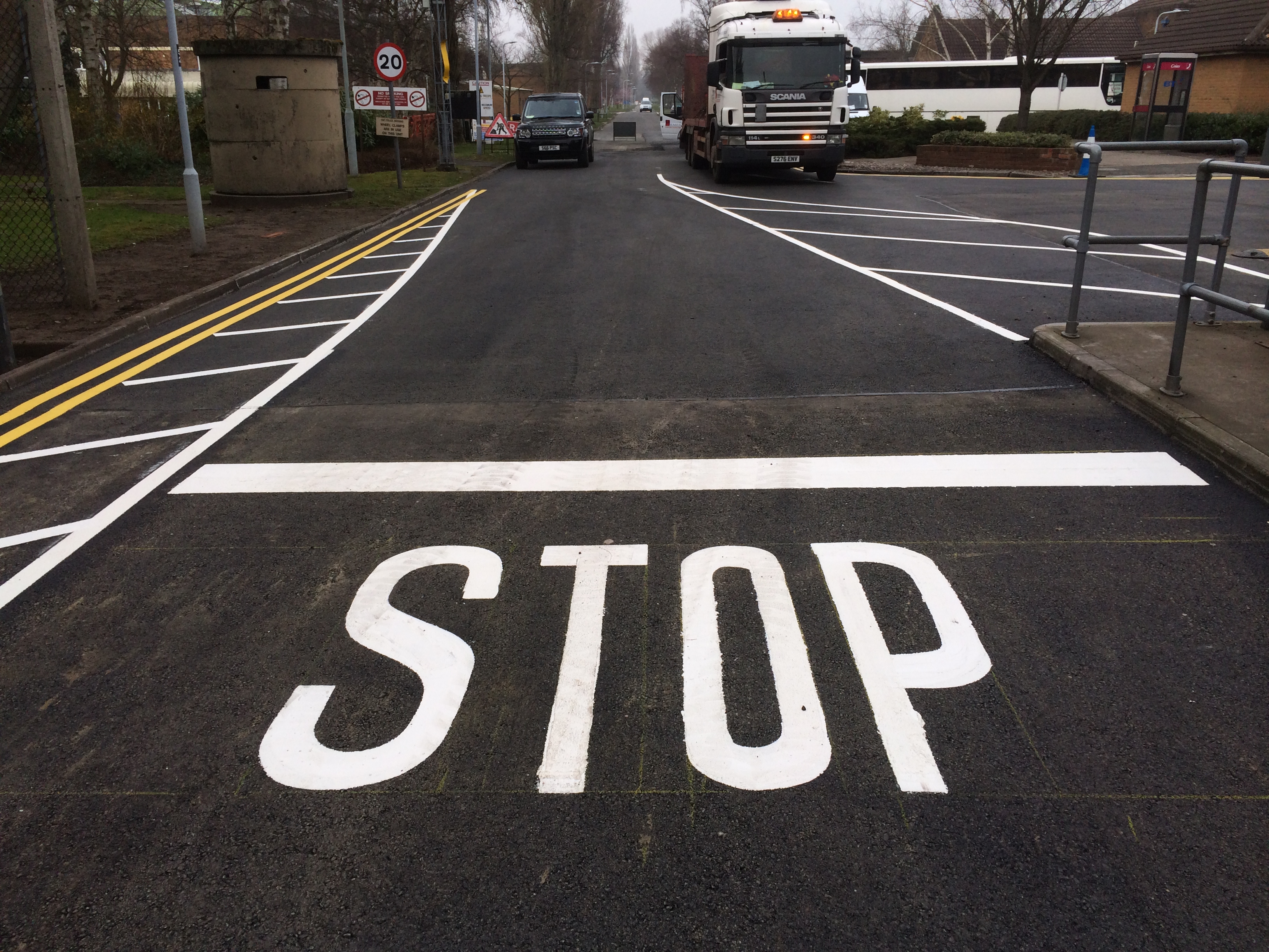 The works included precise line marking installation across access roads and parking areas, featuring directional arrows, STOP markings, hatched zones, pedestrian crossing markings and double yellow lines. Each marking was carefully measured and applied to ensure compliance, visibility and long-term durability.